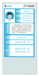 設(shè)備主要用于診室門口信息顯示,如醫(yī)生信息,就診狀態(tài),排隊(duì)情況等。輕便易安裝,適合各診室和候診大廳。